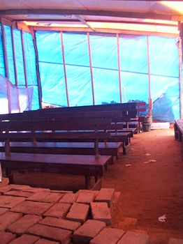 benches made of boards and block, that they were happy to worship the Lord no
