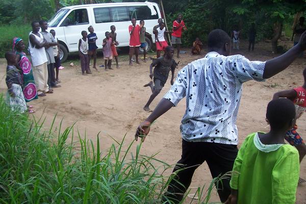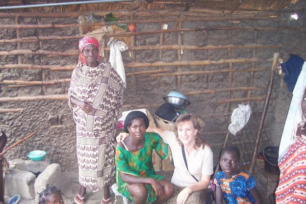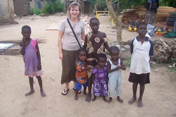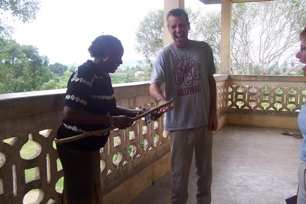 While we men worked that afternoon, my wife Kathy and Brent's wife Hannie played games with many of the children, here Hannie learns to balance a pot on her head like the Africans do.