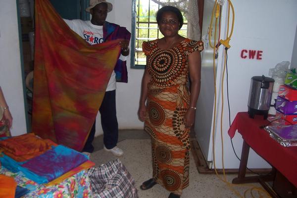 Saturday morning Gideon showed up with some mudcloth made by a woman in his church. Here his mother is modeling her outfit so Mom can possibly recreate it back in Alabama with the ladies she works with.