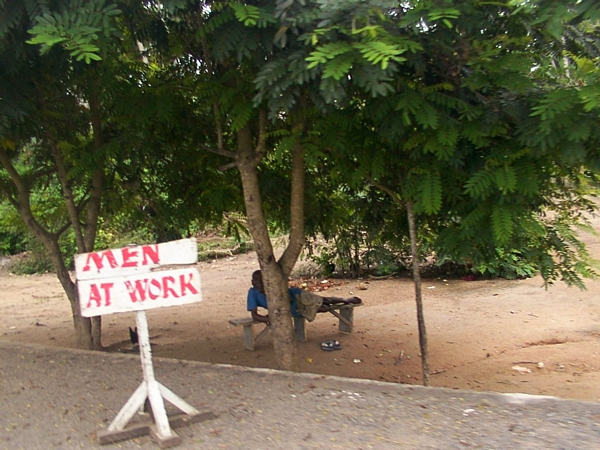 We had packed our lunch, so we sat under these trees and ate at lunchtime. That stuff the village men were eating didn't look too tasty.