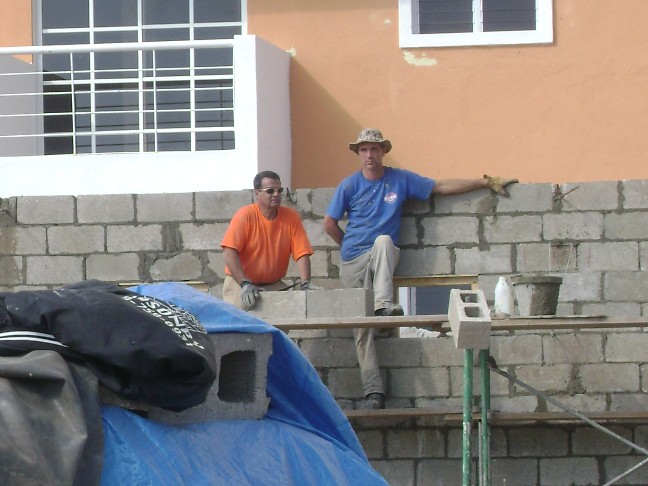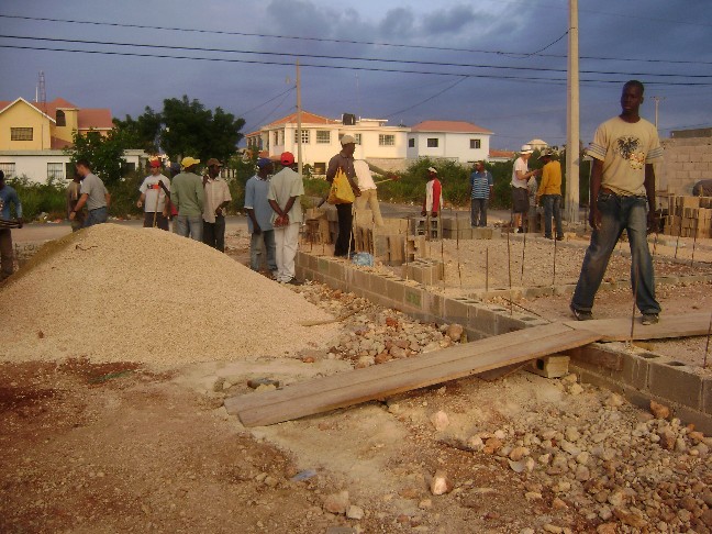 We needed to move some of the block to the inside of the building before we built walls in the way, so John gathered his new friends and we started a block line, handing off the block one to another until we had it moved inside.