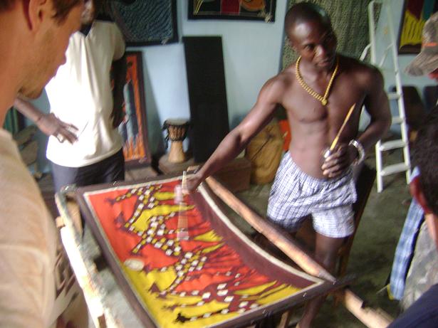The man that offered to guide us followed as did another man. As we came to an intersection in the road, we started to go on what looked like the most traveled road when the guide told us we were going the wrong way. He told us that the castle was in the other direction. We reluctantly followed. In the back of our minds was the thought that the guide was leading us into some sort of ambush since we didn't want to pay his price. We decided to follow anyway. We soon came upon a house on the mountainside. There was a man out on the porch asking us to come in, the guide insisted that we go in also. We wondered, ambush? I looked in the house from outside and saw a bunch of artwork hanging inside. We followed the man inside where he showed us his work. He did what is called Batik. He puts wax on the cloth, the dyes the cloth around the wax to form the images. Here he is showing us how it is done.