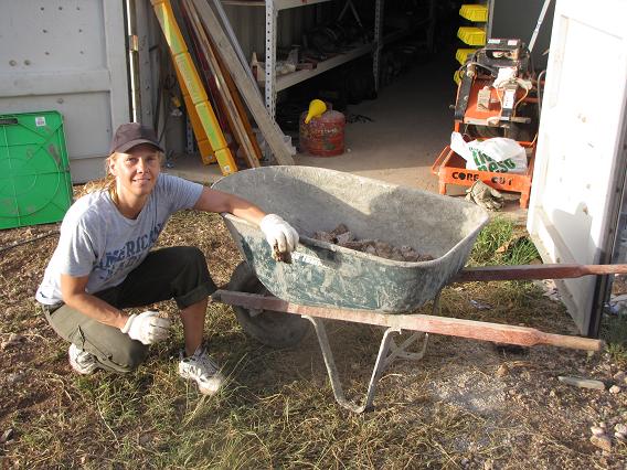 Lori liked things neat. She picked up a lot of trash and here she is picking up rocks from around the job to help fill in the floor.