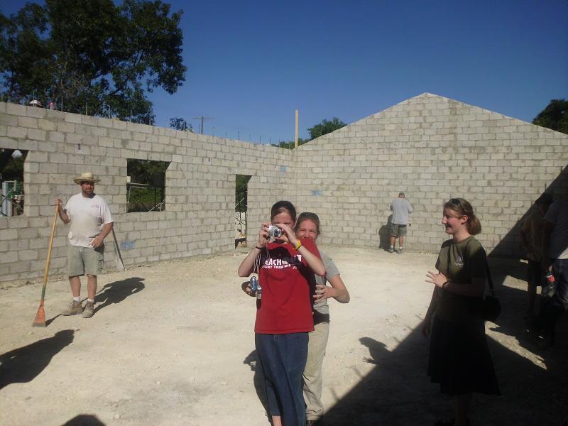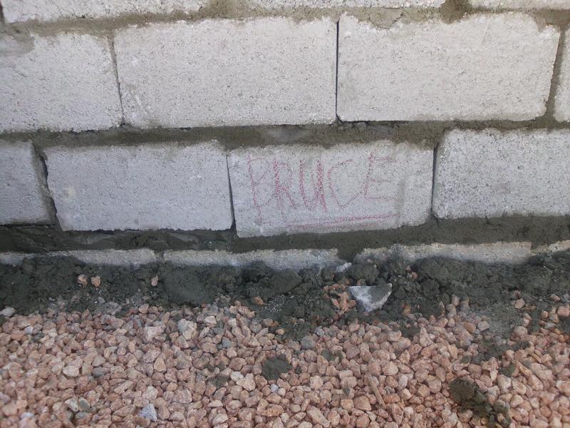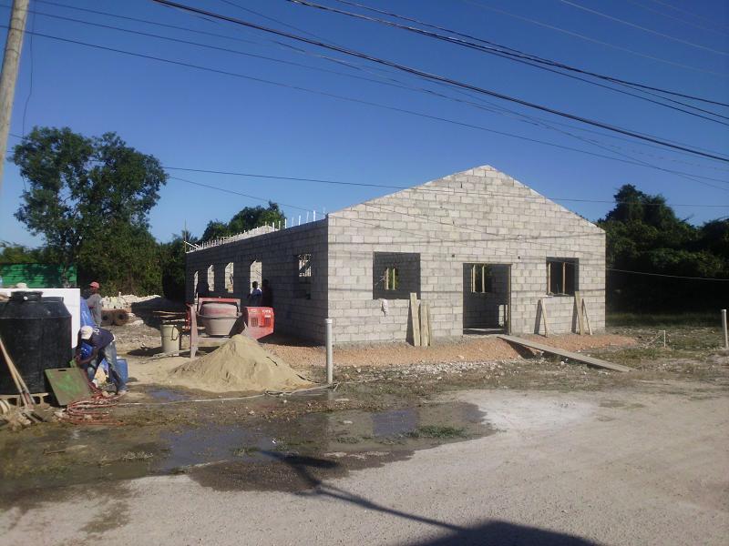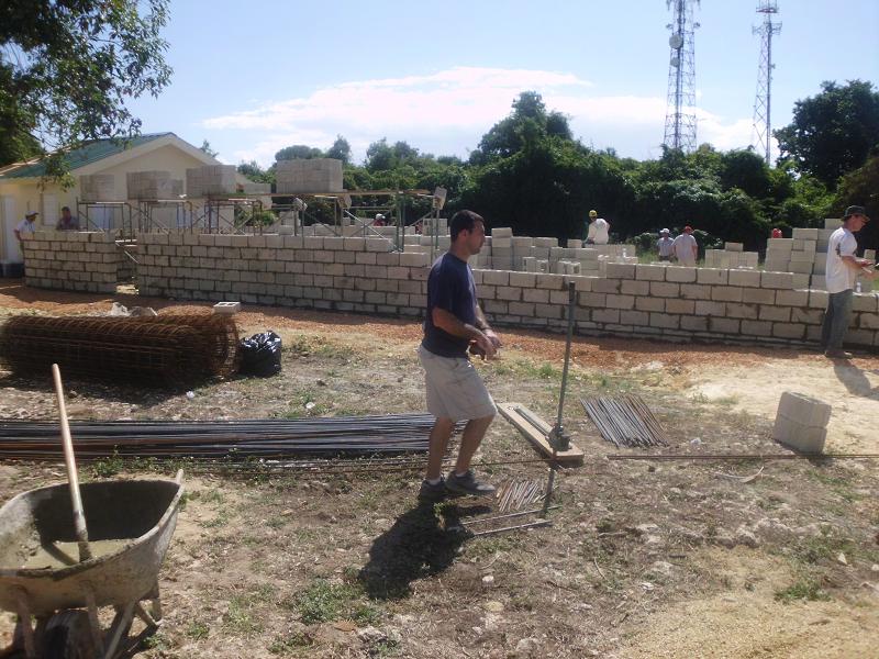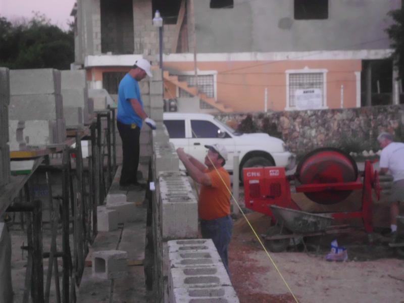Soon thereafter, you can see the north wall coming up. If you look at the bottom course of block, you'll notice they go from a full 8" block at the rear of the building to nothing at the front. (left to right) That was to compensate for the out of level foundation. The man in the foreground is Nate Jude, he is the missionary pastor of the church.